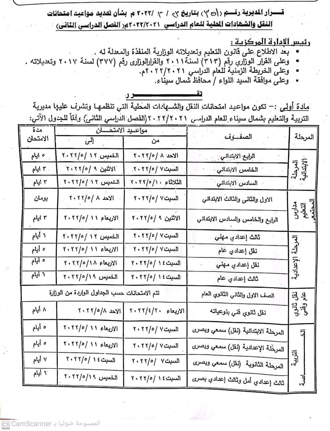 أعلنت مديرية التربية والتعليم بشمال سيناء جدول مواعيد امتحانات النقل والشهادات المحلية للفصل الدراسي الثاني.