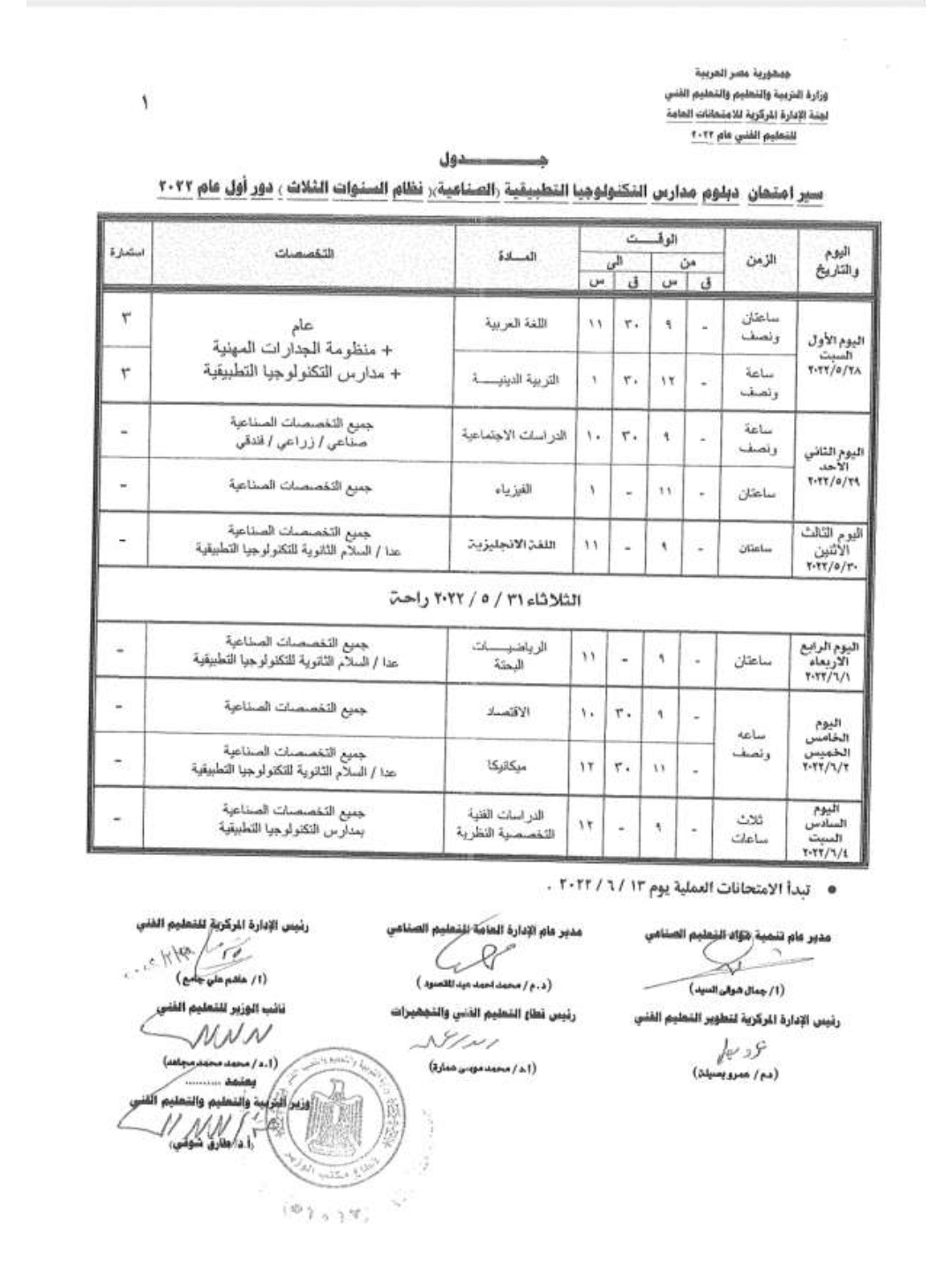 -يوم السبت الموافق 4 يونيو امتحان مادة الدراسات الفنية التخصصات النظرية لجميع التخصصات الصناعية بمدارس التكنولوجيا التطبيقية.