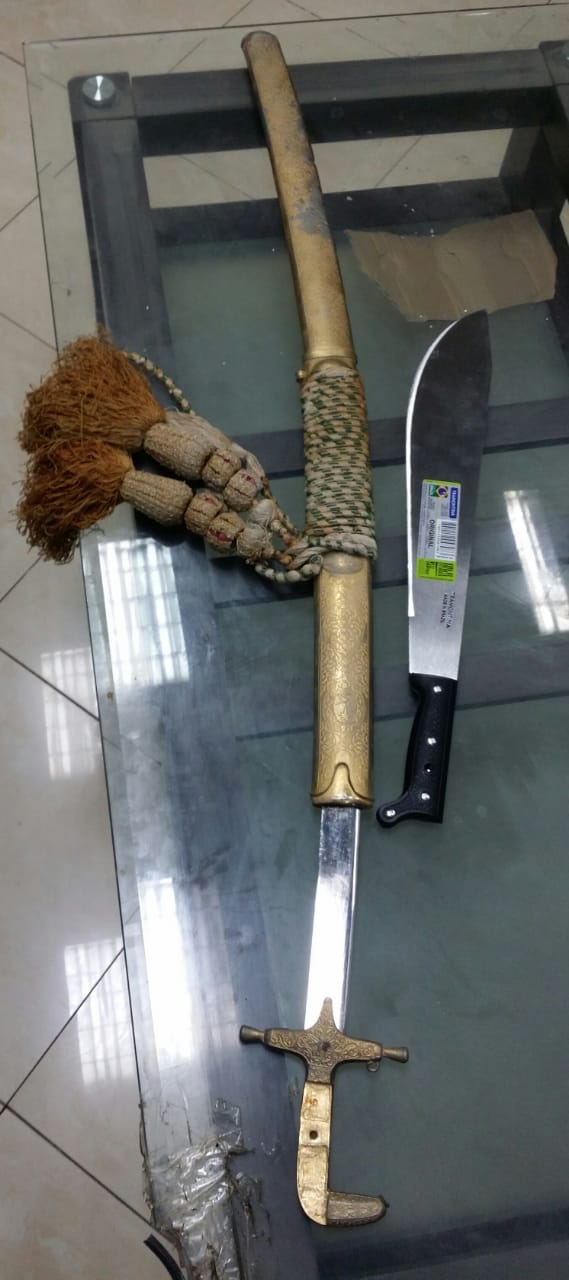 وتم تمرير حقائب الراكب علي جهاز الفحص بأشعة X-RAY بمعرفة السيد عياد مأمور الفحص وحسن علي أبو الفتوح مدير إدارة الفحص فكشف وجود هيكلين لأسلحة بيضاء، وتبين وجود سيف ذو نصل حاد ومقبض وجراب من معدن وسنجة من معدن لها نصل حاد ومقبض من لدائن.