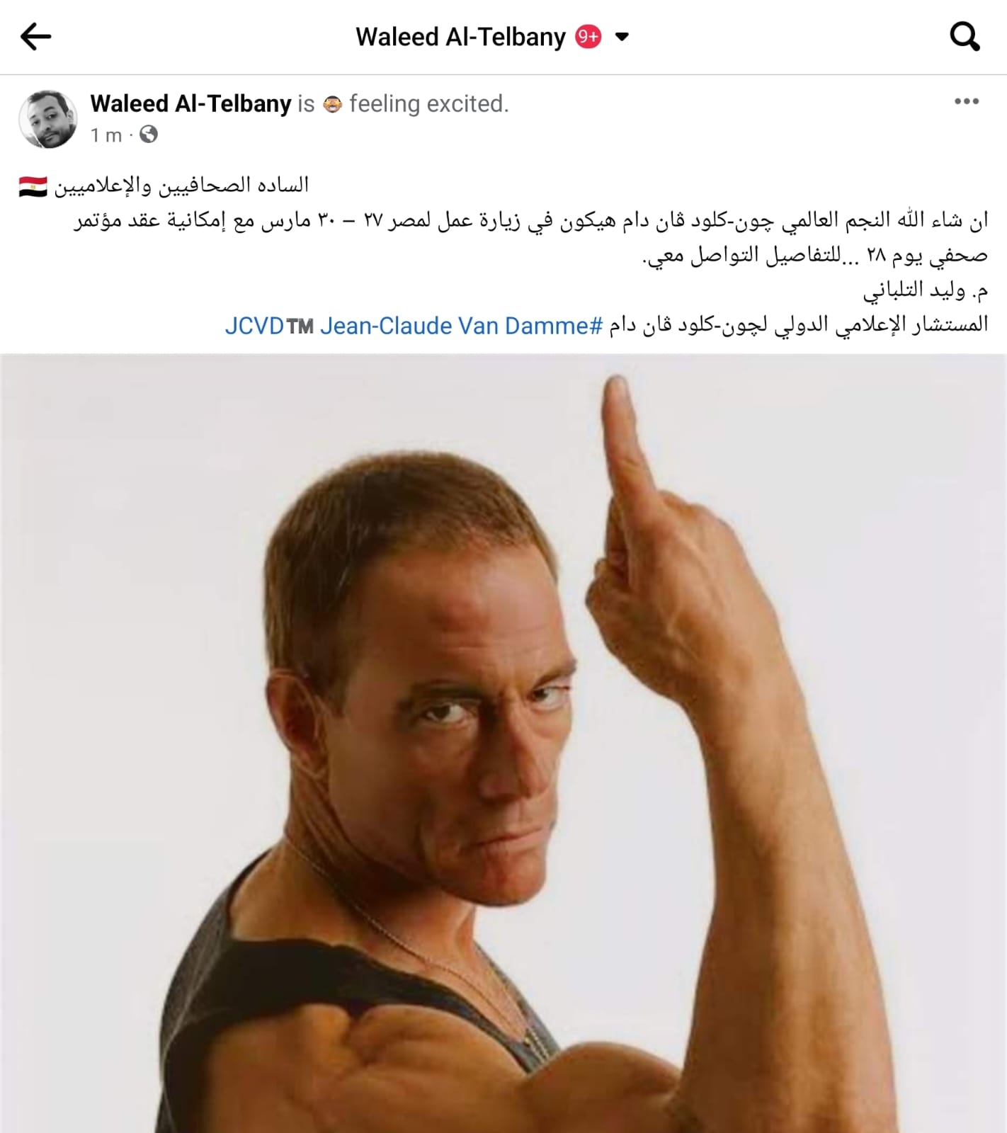 وأكد التلباني، أن فان دام، كان يرغب في التصوير بمصر، منذ آخر زيارة له إلى القاهرة، حيث سحرته المناطق الأثرية الفرعونية والدينية، وحتي الآن هناك عدة أماكن في مصر يريد فان دام التصوير داخلها، مثل الأهرامات، وبعض شوارع مصر الأثرية.