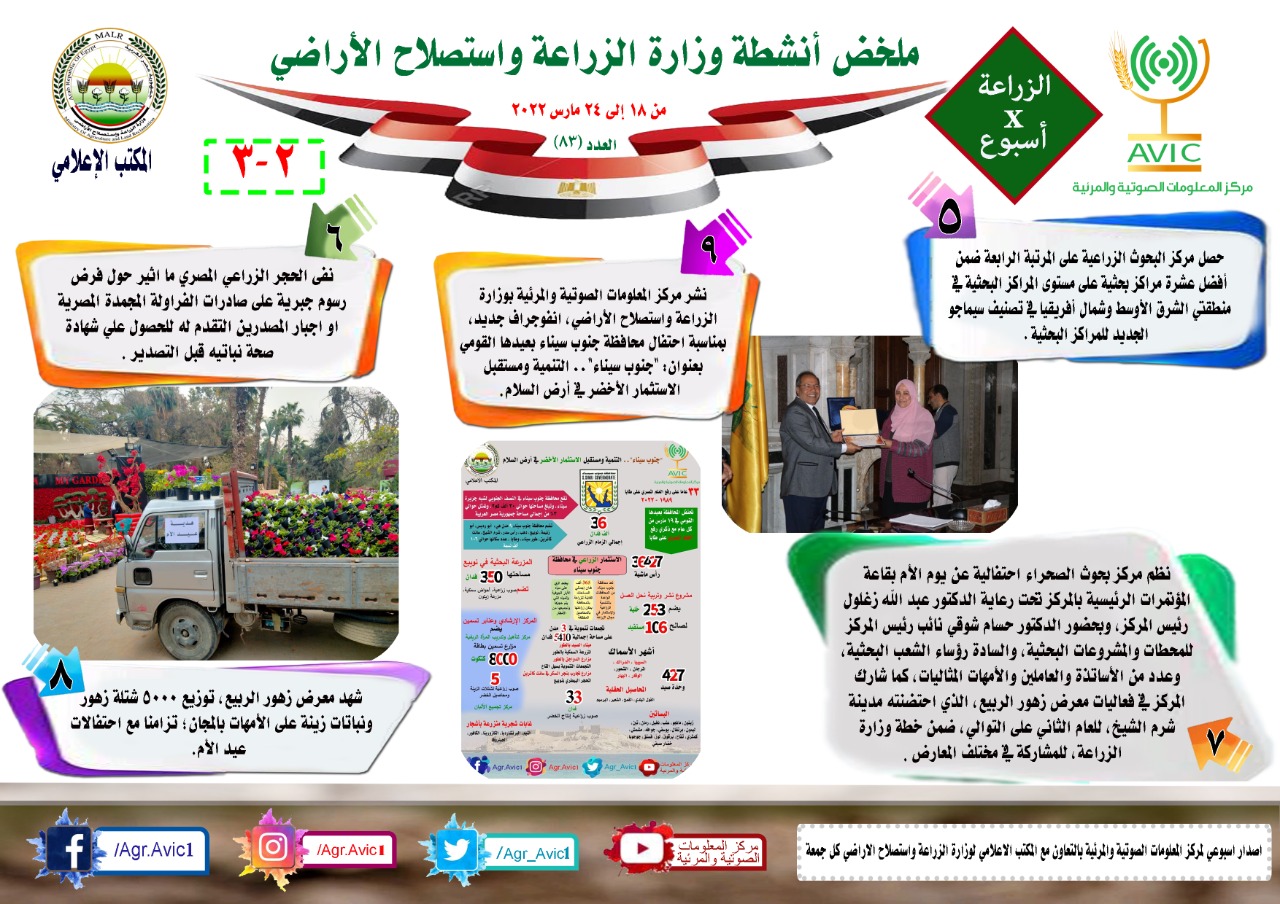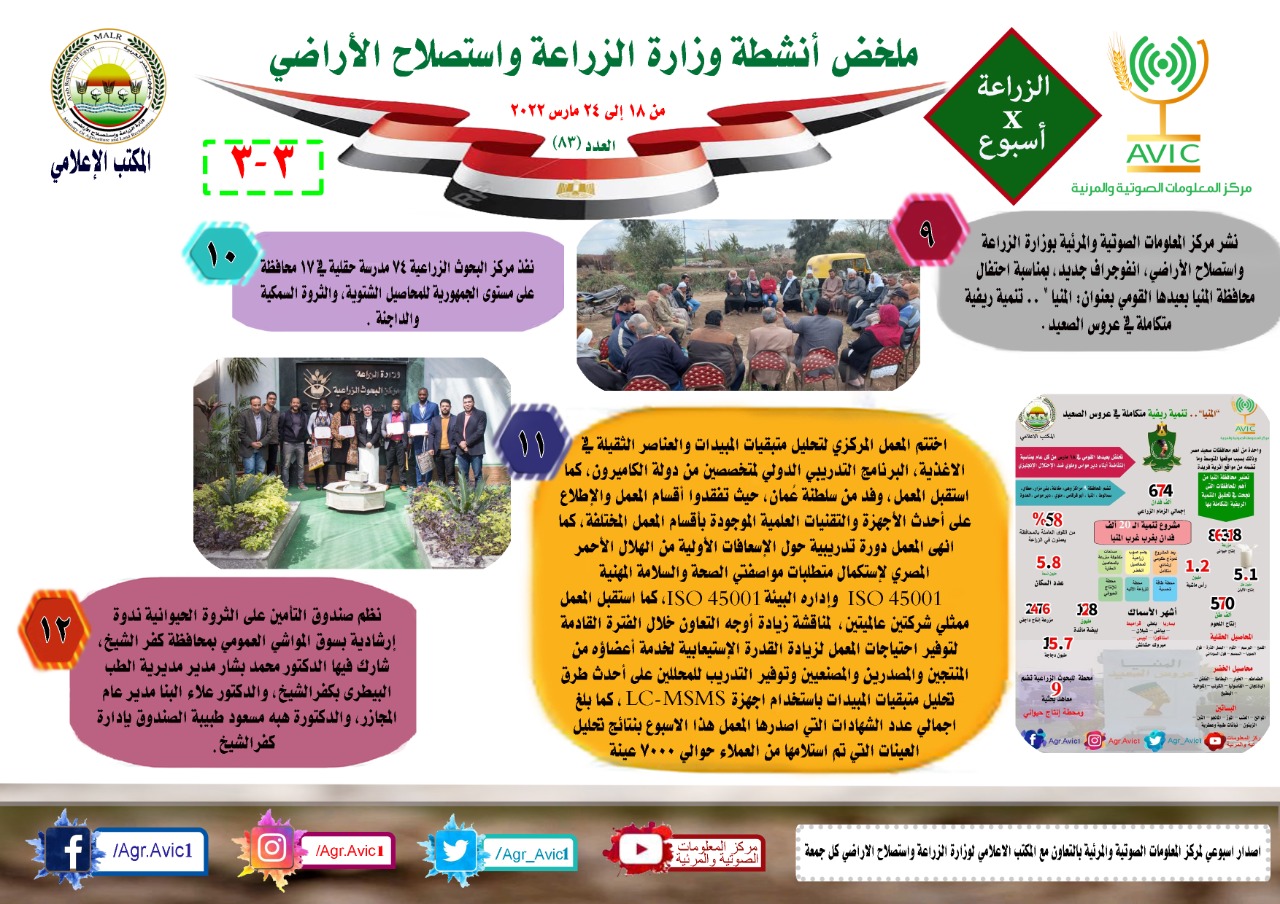 أصدر مركز المعلومات الصوتية والمرئية، التابع لوزارة الزراعة واستصلاح الأراضي، الانفوجراف الأسبوعي في نسخته رقم 83، حول الحصاد الأسبوعي لأهم أنشطة الوزارة، خلال الأسبوع الماضي في الفترة من 18 إلى 24 مارس الجاري، وذلك بالتعاون مع المكتب الإعلامي للوزارة، كما أصدر المركز أيضا ملخصا بالفيديو، حول أنشطة الوزارة خلال نفس الفترة.