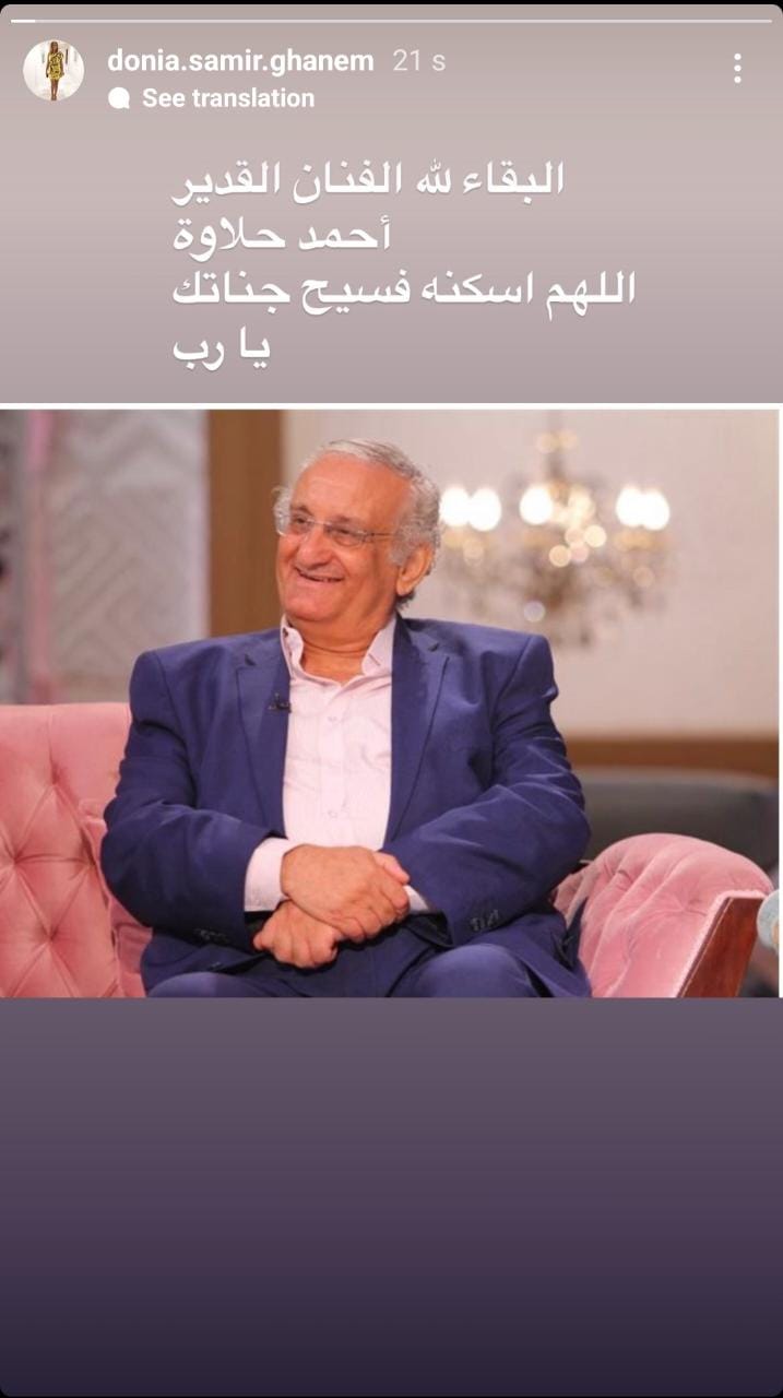 وكتبت دنيا سمير غانم عبر حسابها بموقع التواصل الاجتماعي، انستجرام: البقاء لله الفنان القدير أحمد حلاوة، اللهم اسكنه فسيح جناته يا رب.