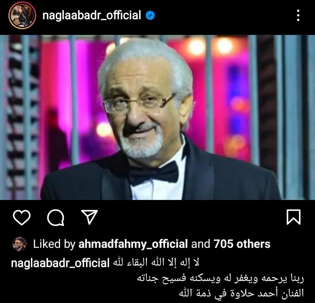كما حرصت النجمة نجلاء بدر على نعي الفنان الراحل أحمد حلاوة، ونشرت عبر حسابها بموقع انستجرام، صورة للفنان الراحل أحمد حلاوة معلقة: لا إله إلا الله، البقاء لله ربنا يرحمه ويغفر له، ويسكنه فسيح جناته، الفنان أحمد حلاوة في ذمة الله.