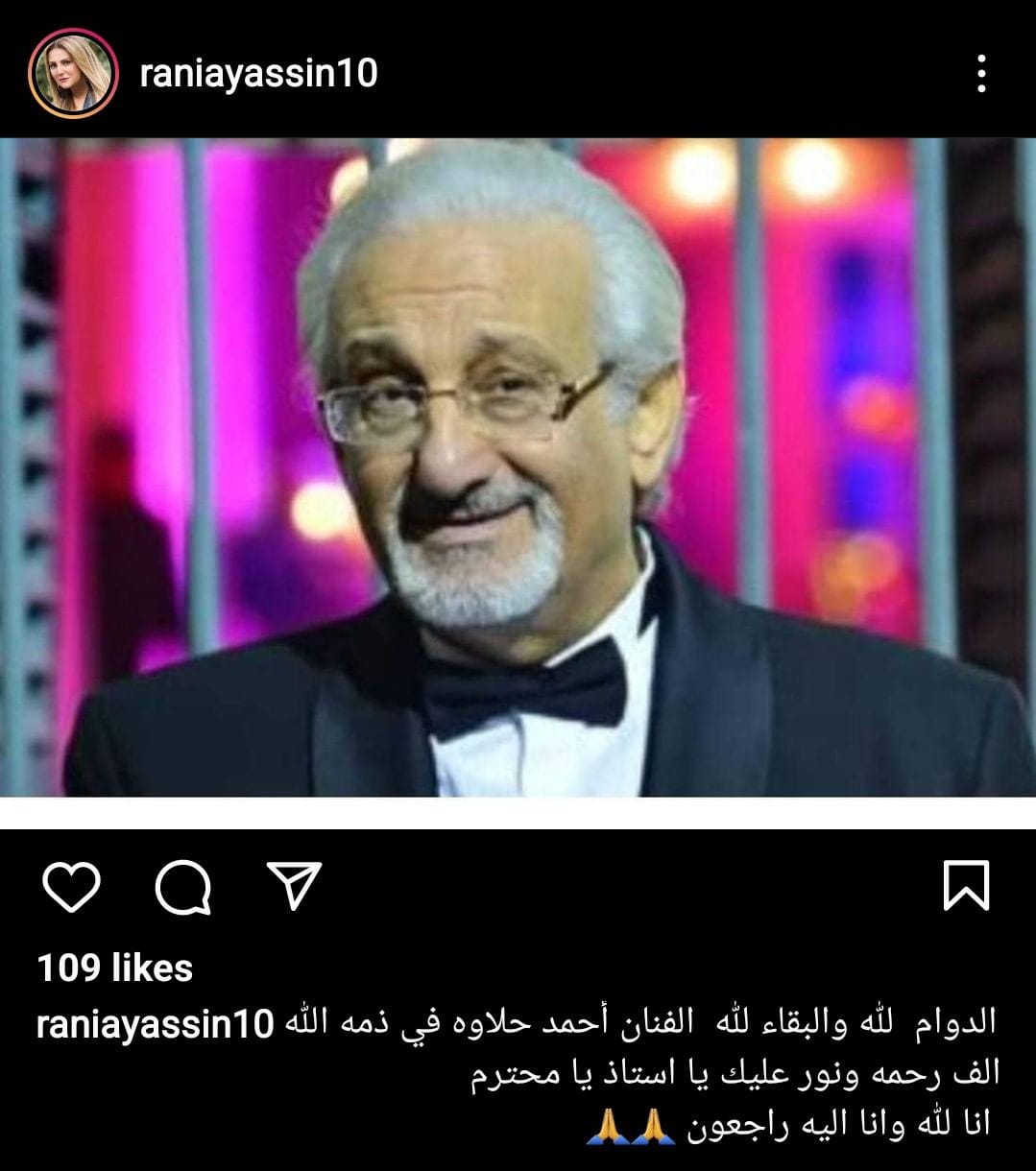 ونعت رانيا محمود ياسين الفنان أحمد حلاوة وكتب عبر، انستجرام: الدوام لله، والبقاء لله، الفنان أحمد حلاوة في ذمة الله، ألف رحمة ونور عليك يا أستاذ يا محترم، إنا لله وإنا إليه راجعون.
