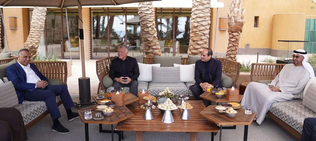 استقبل العاهل الأردني الملك عبدالله الثاني، اليوم الجمعة، الرئيس عبد الفتاح السيسي، والشيخ محمد بن زايد آل نهيان، ولي عهد أبوظبي، نائب القائد الأعلى للقوات المسلحة في دولة الإمارات العربية المتحدة، ورئيس مجلس الوزراء العراقي مصطفى الكاظمي، اليوم الجمعة، في مدينة العقبة، حيث عقد معهم لقاء أخويًّا- وفق بيان للديوان الملكي الأردني-.