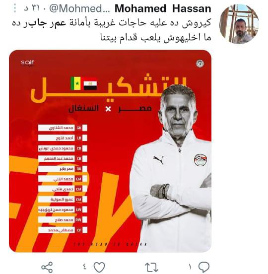 وقال أحد المعلقين: من وجهة نظري غير موفق عمر جابر وصلاح، في مواجهة ماني صعب جدا من الناحية الدفاعية، وآخر مفاجآت كيروش لينا مش السنغال، ربنا يستر.