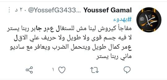 ونشر أحد المغردين: يا جماعة أي حوار عمر جابر ده، أنا قاعد في الاستاد مش فاهم حاجة، وحساب آخر مش قادر أفهم عمر جابر هيلعب مع ساديو ماني ازاي.