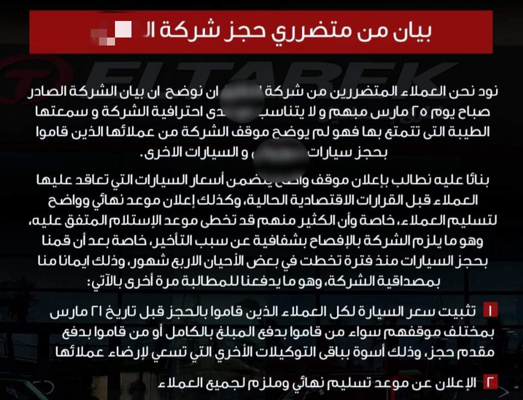 نود نحن العملاء المتضررين من شركة - ط - بإعلان موقف واضح يتضمن أسعار السيارات التي تعاقد عليها العملاء قبل القرارات الاقتصادية الحالية، وكذلك إعلان موعد نهائي من أجل تسليم العملاء، خاصة أن كثير منهم تخطى الموعد المحدد لاستلام سيارته.