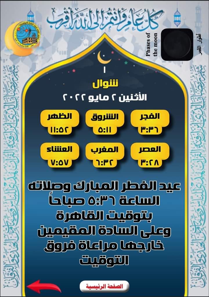 أعلن المعهد القومي للبحوث الفلكية والجيوفيزيقية، موعد وتوقيت صلاة عيد الفطر المبارك لعام 1443 هجرية الموافق 2022.