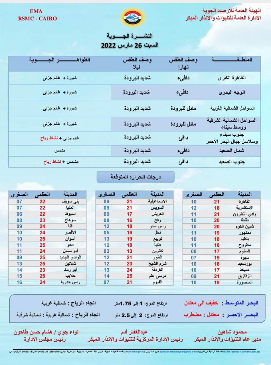 يتوقع خبراء الأرصاد، أن يسود خلال النهار طقس دافئ على القاهرة الكبرى والوجه البحري صباحا، وشديد البرودة ليلا، وطقس مائل للبرودة على السواحل الشمالية صباحا وشديد البرودة ليلا، ودافئ على شمال الصعيد صباحا، وشديد البرودة ليلا، كما تشهد جنوب سيناء وجنوب الصعيد طقس شديد البرودة ليلا، متوقعين سقوط أمطار خفيفة إلى متوسطة على مناطق من السواحل الشمالية وشمال الوجه البحري على فترات متقطعة.