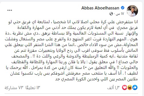 وأكد عباس خلال منشور له عبر صفحته الرسمية على موقع التواصل الاجتماعي فيسبوك، أنه لا يفضل مشاهدة مباريات الكرة المحلية وأنها كانت تجربة غير مرضية بالنسبة له، قائلًا: إنها كانت محاولة خاطئة والسبب في تنفيره من مباراة مصر والسنغال هو التعليق على المباراة، والذي قام به مدحت شلبي.