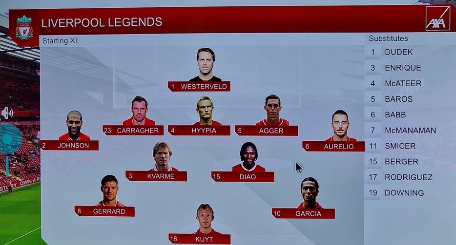 وشهدت المُباراة مُشاركة عدة أساطير، أمثال جيرارد، كاراجير، جارسيا، كاوت، آجير، دوديكن، ريفالدو، دايڤيز وغيرهم.