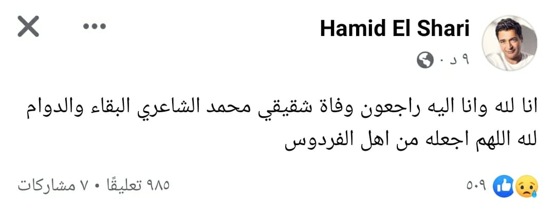 وكتب حميد الشاعري، عبر حسابه الرسمي على موقع التواصل الاجتماعي فيسبوك: إنا لله وإنا إليه راجعون وفاة شقيقي محمد الشاعري البقاء والدوام لله اللهم أجعله من أهل الفردوس.