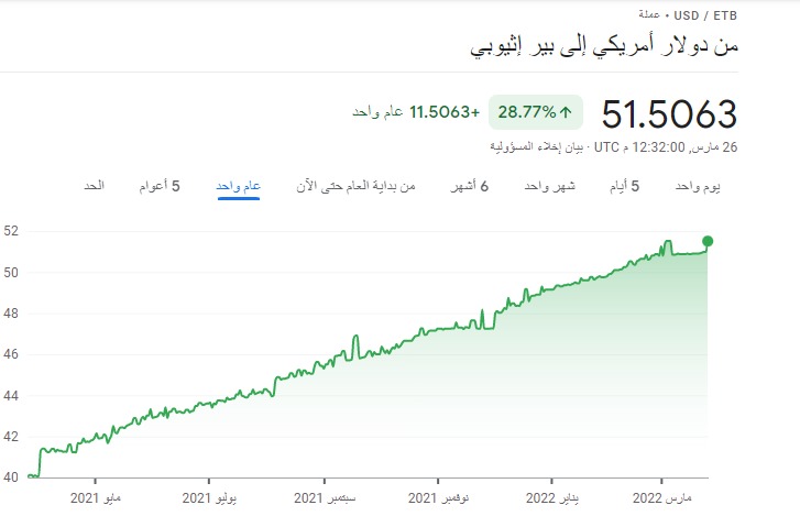 وعلى ذات السياق دولة إثيوبيا المستنفدة اقتصاديا في الحرب الداخلية التي بدأت في نوفمبر عام 2020، بين الجيش الإثيوبي والجبهة الشعبية لتحرير إقليم تيجراي، مما أثر في معدل التضخم بإثيوبيا الذي وصل إلى 35.1٪ في ديسمبر عام 2021، والذي يعد أعلى معدل على مدار 10 سنوات المنصرمة، وبالانتقال لتأثير ذلك على أداء البير الإثيوبي مقابل الدولار الأمريكي فمنذ اندلاع الحرب الأهلية في نوفمبر 2020 إلى الوقت الحالي فقد البير الإثيوبي 28.34% من قيمته، إلا أن الحرب الروسية الأوكرانية لم تكن بذلك التأثير على البير الإثيوبي، حيث انخفضت قيمة الأثيوبي إلى 1.35% فقط منذ اندلاع الحرب إلى الآن، ليسجل الدولار اليوم 51.50 بير إثيوبي مقابل 50.80 يوم 24 فبراير 2022.