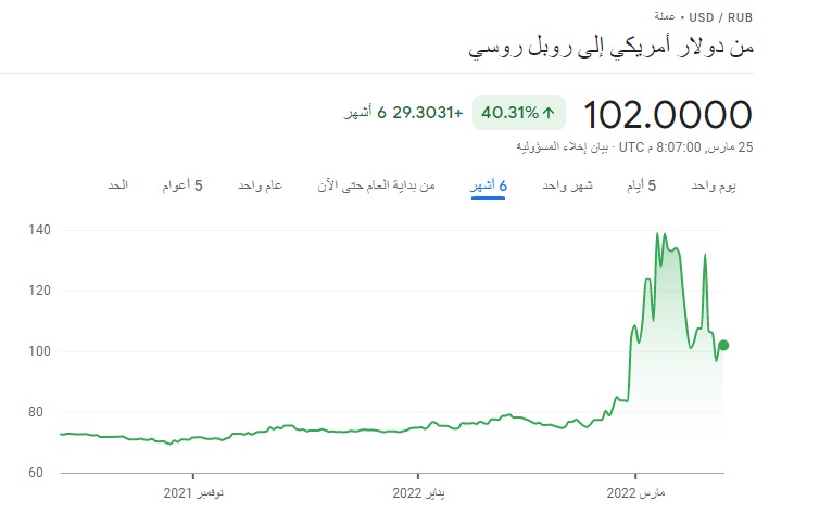 أدت العقوبات الاقتصادية المفروضة على روسيا من قبل الاتحاد الأوربي والولايات المتحدة جراء بدء العمليات العسكرية في أوكرانيا، والتي تهدف إلى شل الاقتصاد الروسي، إلى خسارة الروبل الروسي 16.71% من قيمته مقابل قيمة الدولار، وذلك منذ أن شرعت روسيا في هجومها على أوكرانيا إلى يومنا هذا، حيث سجل الدولار اليوم 102 روبل روسي مقارنة ب 84.95 يوم 24 فبراير.