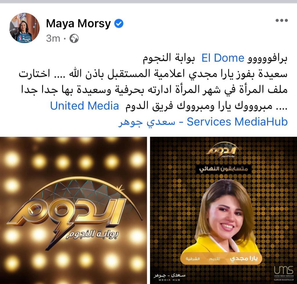 وكتبت مايا مرسي عبر صفحتها علي موقع التواصل الاجتماعي فيسبوك: برافووووو الدوم بوابة النجوم، سعيدة بفوز يارا مجدي اعلامية المستقبل باذن الله اختارت ملف المرأة في شهر المرأة ادارته بحرفية وسعيدة بها جدا جدا مبروووك يارا ومبرووك فريق الدوم و سعدي جوهر.