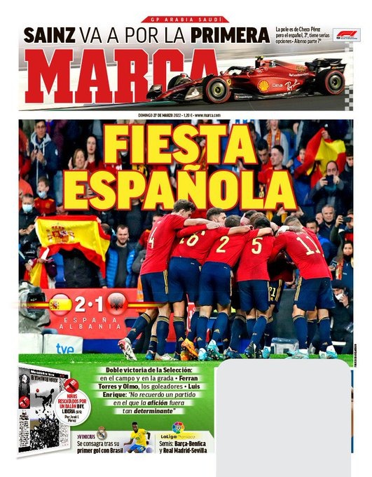 سلطت ماركا الضوء في غلافها على فوز منتخب إسبانيا أمام ألبانيا وديًا، كما أشادت بأداء فينيسيوس مع البرازيل، تحت عنوان فينيسيوس يكرس نفسه بعد هدفه الأول مع البرازيل.