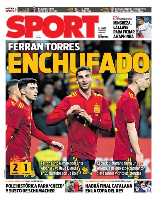 قالت سبورت في غلافها اليوم، فيران توريس موصول بالكهرباء، وذلك بعد تألق نجم برشلونة رفقة الماتادور أمام ألبانيا بهدف في المباراة التي انتهت بنتيجة 2-1، حيث افتتح فيران التسجيل ضد ألبانيا ولديه الآن 13 هدفًا في 23 مباراة مع لاروخا.