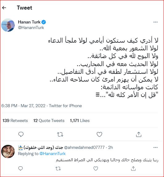 وفي أول تغريدة لها بعد تعرضها لأزمة صحية، كتبت حنان ترك عبر توتير: لا أدري كيف ستكون أيامي لولا ملجأ الدعاء، لولا الشعور بمعية الله، ولا البوح لله في كل ضائقة، لولا الحديث معه في المحاريب لولا استشعار لطفه في أدق التفاصيل، لا يمكن أن يهزم امرئ كان سلاحه الدعاء كانت مواساته الدائمة، قل إن الأمر كله لله.