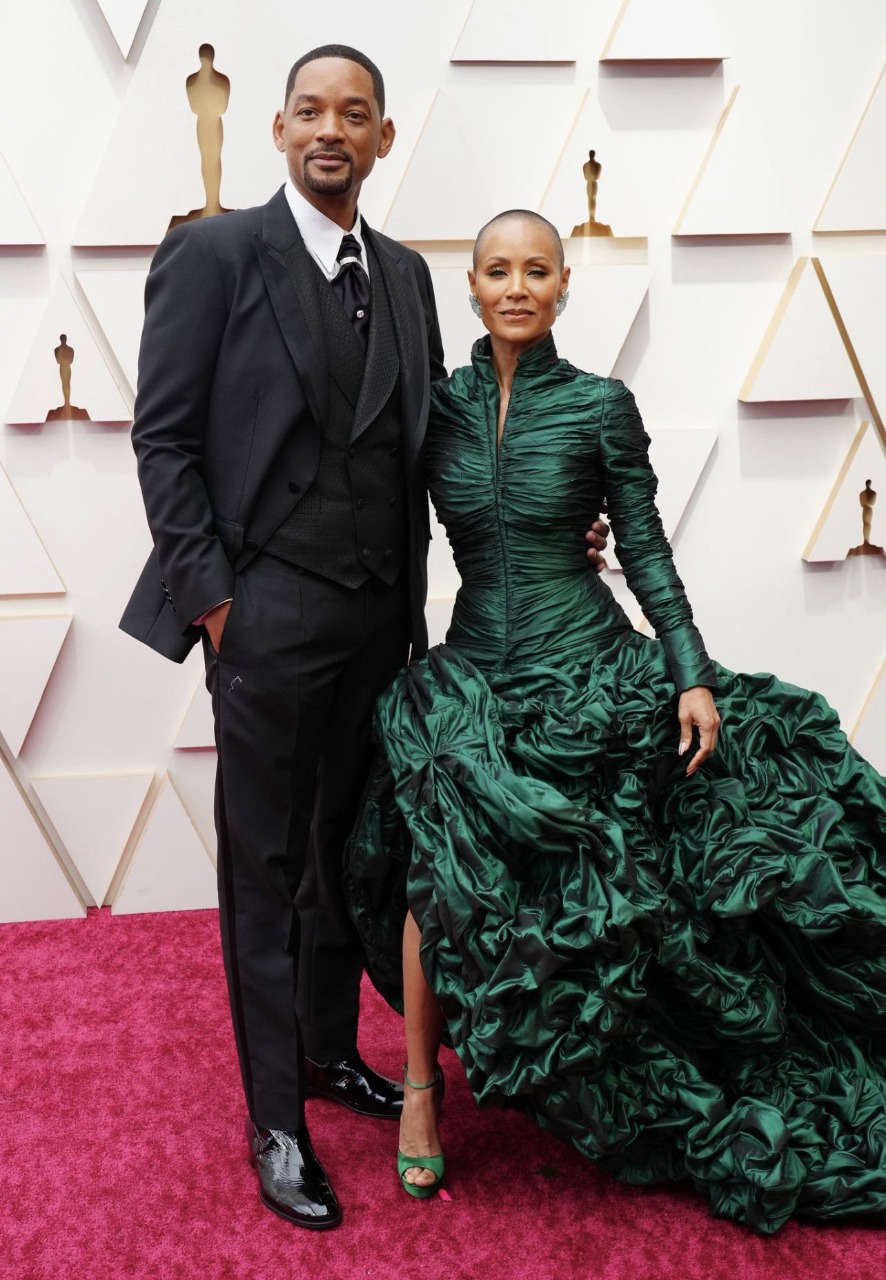 وظهر ويل سميث رافعًا علامة النصر بجانب زوجته جادا بينكيت بفستان باللون الأخضر، وإكسسوارات بسيطة حيث أرتدت حلق فقط، كما حرصت على وضع مكياج بسيط والظهور بطبيعتها.