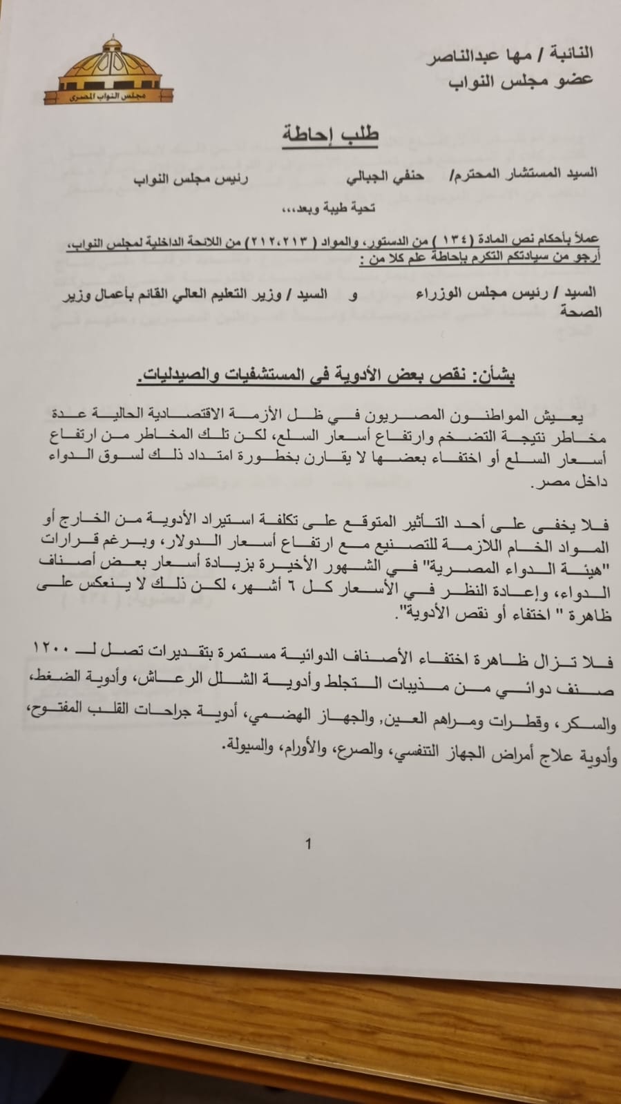 تقدمت النائبة مها عبدالناصر، عضو مجلس النواب عن الحزب المصري الديمقراطي الاجتماعي، بطلب إحاطة إلى المستشار حنفي الجبالي، رئيس مجلس النواب، مُوجهًا إلى الدكتور مصطفى مدبولي، رئيس مجلس الوزراء، والدكتور خالد عبدالغفار، وزير التعليم العالي القائم بأعمال وزير الصحة، بشأن نقص بعض الأدوية في المستشفيات والصيدليات.