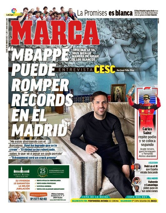 تصدر سيسيك فابريجاس غلاف صحيفة ماركا لعدد اليوم، وذلك بعد تصريحاته عن كيليان مبابي صفقة ريال مدريد المقبلة، حيث عنونت الصحيفة بتصريح فابريجاس: يمكن لمبابي تحطيم الأرقام القياسية في مدريد.