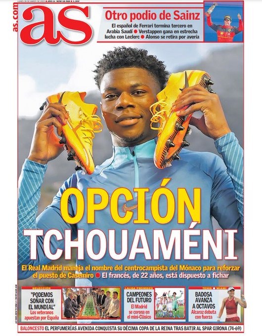 عنونت آس في غلافها اليوم بـ خيار تشاوميني، حيث أشارت الصحيفة إلى أن نجم فريق موناكو الفرنسي البالغ من العمر 22 عامًا على استعداد للتوقيع مع ريال مدريد في الفترة المقبلة.