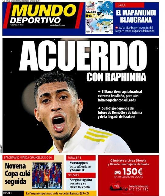 تصدر العنوان اتفاق مع رافينيا، غلاف صحيفة موندو ديبورتيفو لعدد اليوم، حيث قالت الصحيفة إن برشلونة وافق على ضم الجناح البرازيلي، لكنهم ما زالوا بحاجة للتفاوض مع ليدز، كما أن التعاقد معه يعتمد على تطورات مستقبل ديمبلي وأداما تراوري ووصول هالاند.
