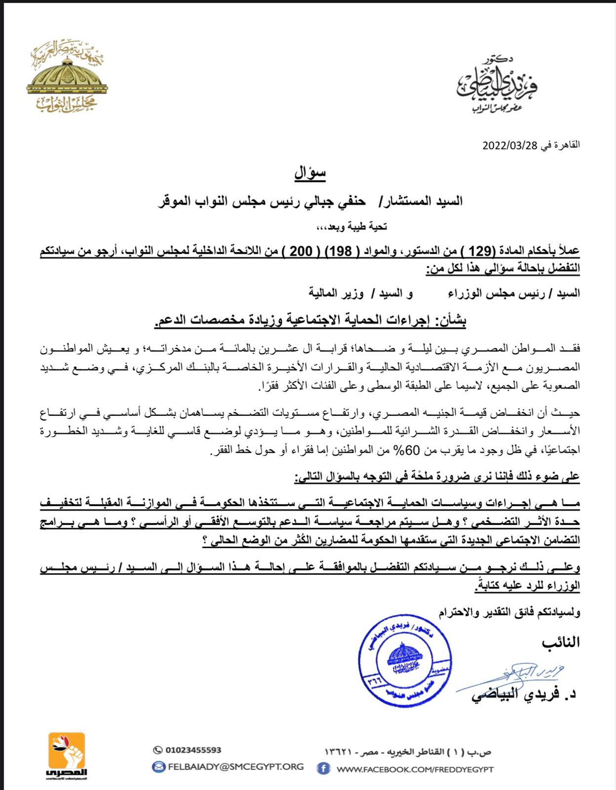 تقدم النائب فريدي البياضي، عضو مجلس النواب عن الحزب المصري الديمقراطي، بسؤال موجه لرئيس الوزراء الدكتور مصطفى مدبولي، وذلك عن تداعيات تخفيض قيمة الجنيه، متساءًلا عن إجراءات الحماية الاجتماعية التي ستتخذها الحكومة لحماية الطبقات المتوسطة والفقيرة.