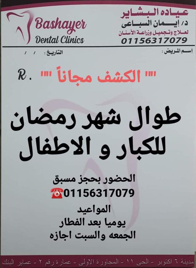 الكشف مجانًا طوال شهر رمضان للكبار والصغار.. مبادرة أطلقتها الطبيبة إيمان السباعي، إخصائي طب وجراحة الفم والأسنان بجامعة 6 أكتوبر، من أجل تخفيف الأعباء عن كاهل المواطنين خلال الشهر الكريم.