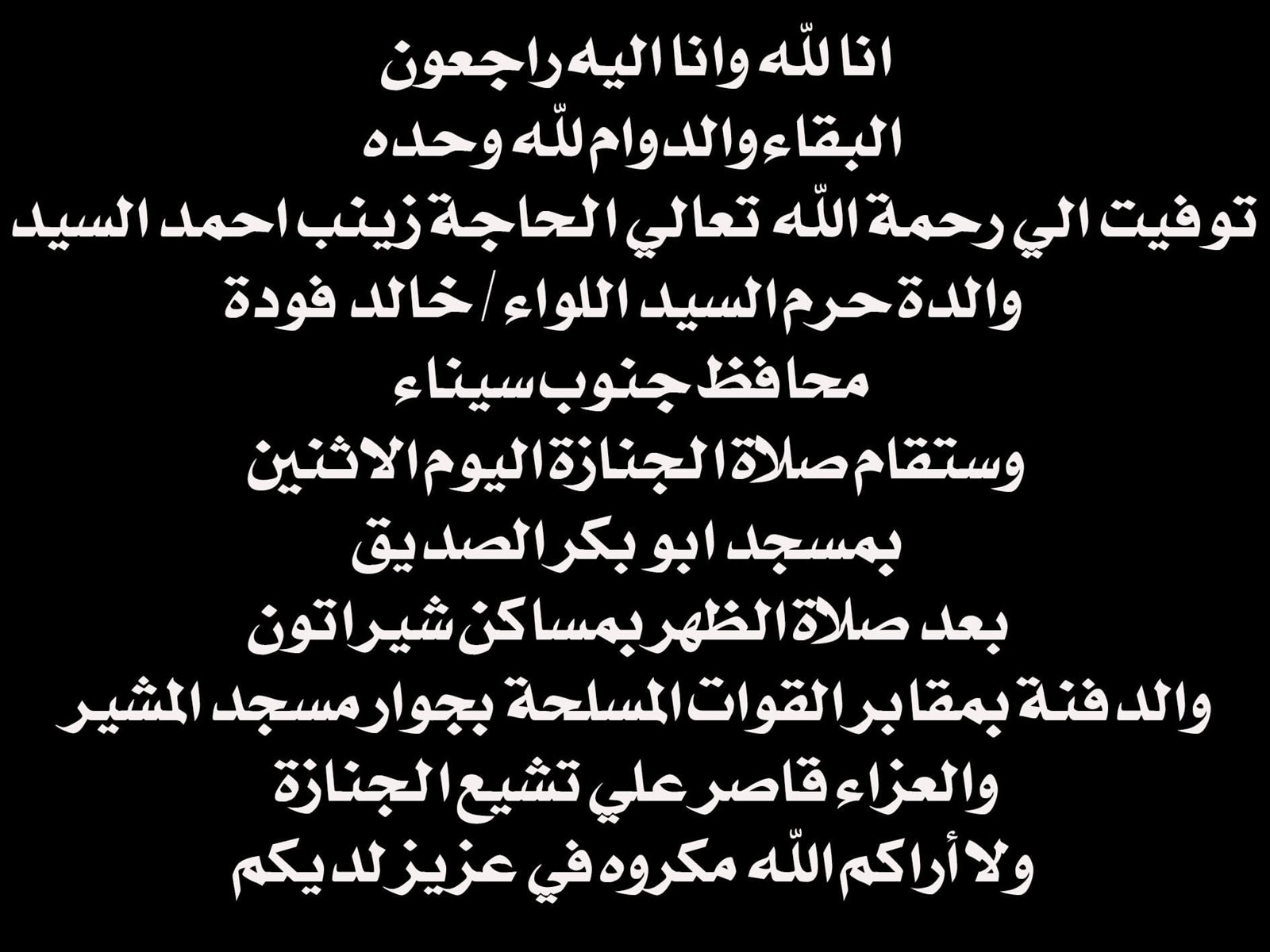 أعلن اللواء خالد فودة محافظ جنوب سيناء، وفاة زينب أحمد السيدة والدة حرمه.