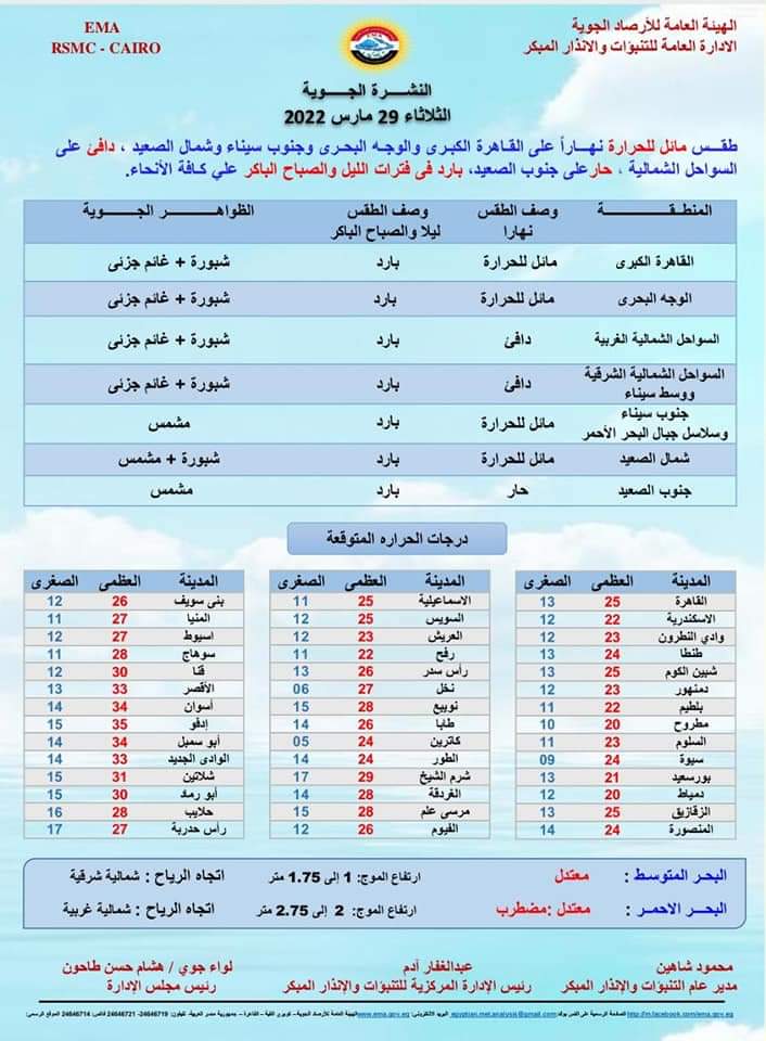 تتوقع الهيئة العامة للأرصاد الجوية أن يسود غدا الثلاثاء الموافق 29 مارس، طقس مائل للحرارة نهارًا على القاهرة الكبرى والوجه البحري وجنوب سيناء وشمال الصعيد، دافئ على السواحل الشمالية، حار على جنوب الصعيد، بارد في فترات الليل والصباح الباكر على الأنحاء كافة.