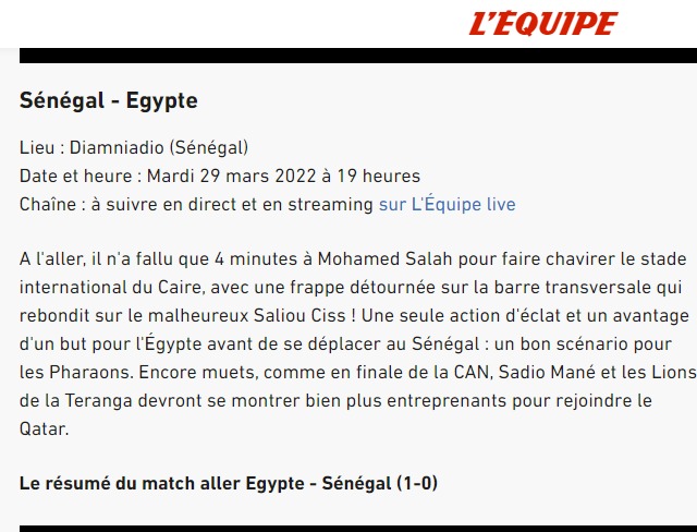 قالت صحيفة ليكيب الفرنسية في تقريرها، إن منتخب مصر نجح في الفوز بمباراة الذهاب بقيادة محمد صلاح، ويحتاج الفراعنة إلى جرأة أكثر من أجل حسم التأهل أمام السنغال.