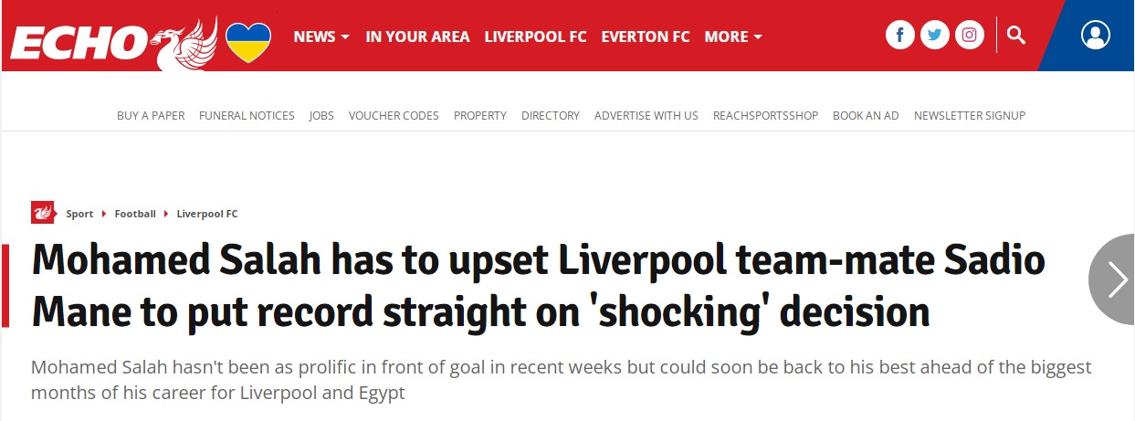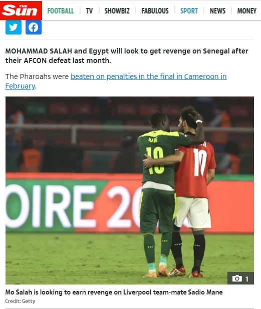 عنونت ذا صن عن مباراة مصر والسنغال اليوم، بـ محمد صلاح ومصر يسعيان لإتمام الانتقام من السنغال، بالتأهل إلى كأس العالم عقب خسارة أمم إفريقيا 2021.