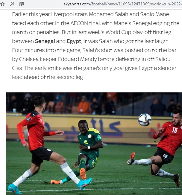 سلطت ذا أثلتيك في تقريرها عن مباراة مصر والسنغال، على مواجهة صلاح وماني، حيث قالت إن العام الحالي غير مسبوق لمحمد صلاح وماني، وسيشهد غياب أحدهما عن نهائيات كأس العالم قطر 2022.