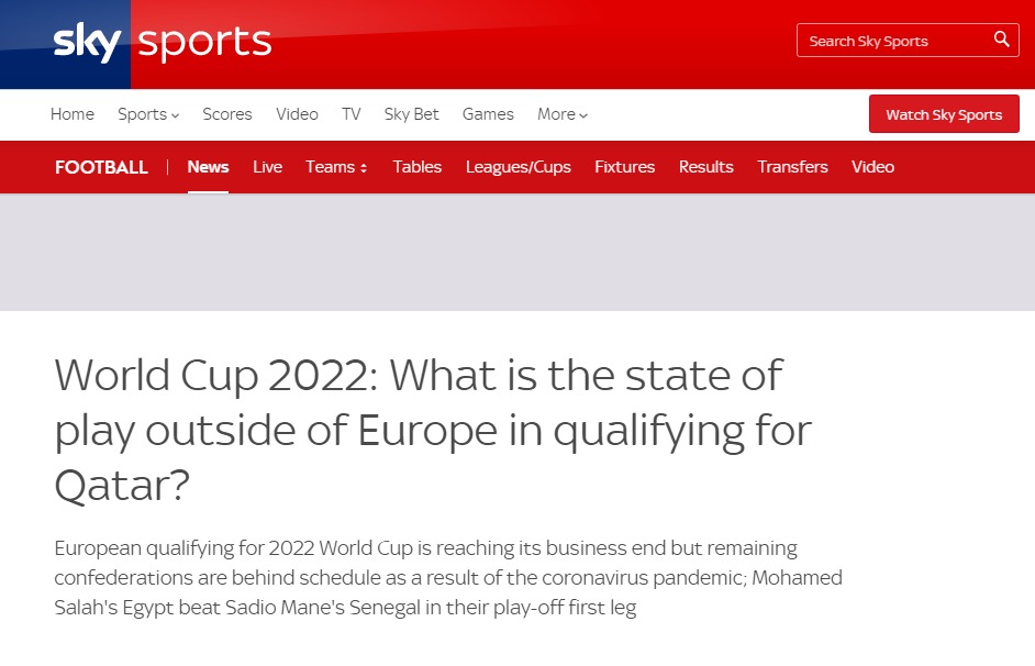 عنونت سكاي سبورتس في تقريرها عن المباراة بـ منتخب مصر بقيادة محمد صلاح هزم ماني ورفاقه، في مباراة الذهاب.. والجماهير تنتظر مواجهة قوية بين مصر والسنغال، خاصة بعد فوز أسود التيرانجا بأمم إفريقيا، على حساب فريق محمد صلاح.
