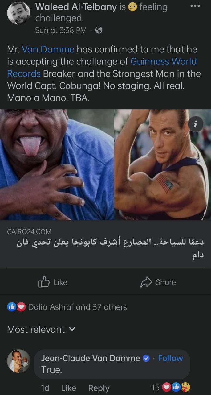 ونشر كابونجا عبر صفحته الشخصية بموقع التواصل الاجتماعي فيس بوك، أن تحدي فان دام سيكون حدثًا عالميًا، مطالبًا متابعيه بالدعاء وتمنى التوفيق.