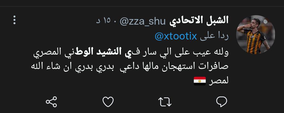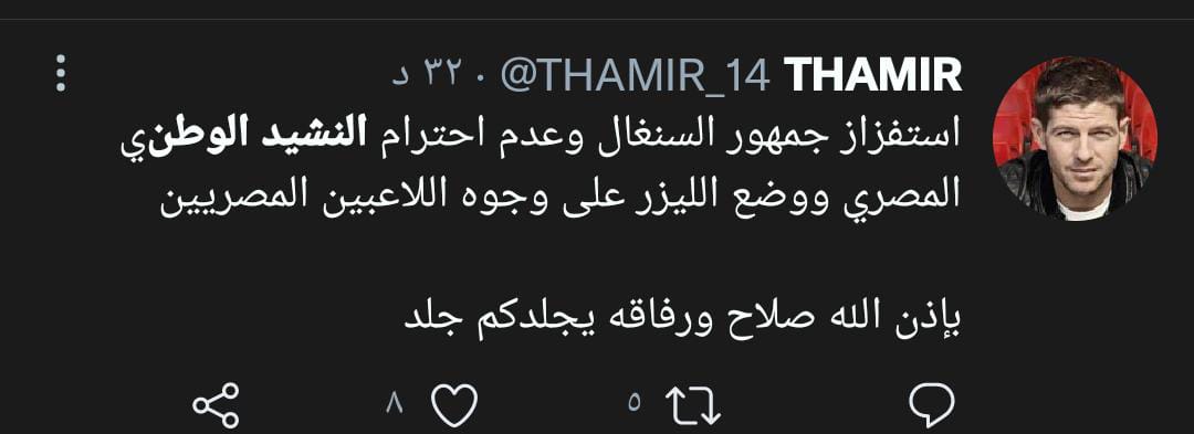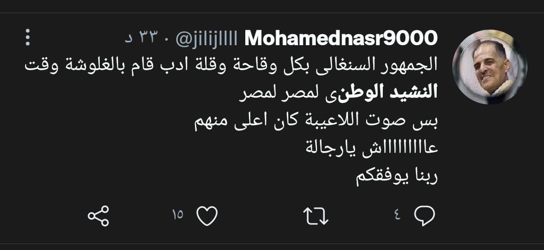 وقال حساب باسم ناصر بن إبراهيم: صورة من صور عدم الاحترام والهجومية، استهجان الجماهير السنغالية أثناء النشيد الوطن المصري.