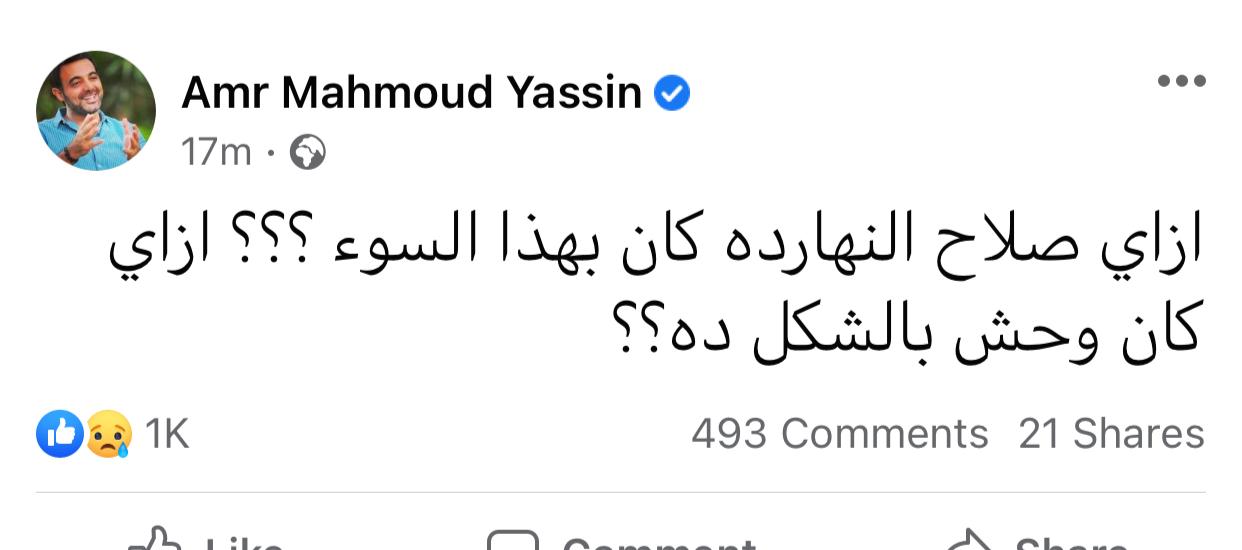 وكتب عمرو محمود ياسين، عبر حسابه الرسمي على موقع التواصل الاجتماعي فيسبوك: إزاي محمد صلاح النهاردة كان بهذا السوء؟ إزاي كان وحش بالشكل دا؟