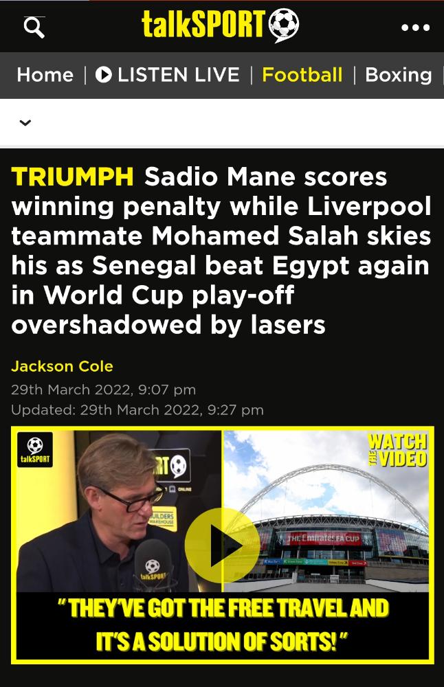 وقالت صحيفة talk sport الإنجليزية، في تقريرها، إن ساديو ماني تفوق على محمد صلاح من جديد بعد أن وضع ركلة الجزاء لقيادة منتخب السنغال إلى كأس العالم 2022.