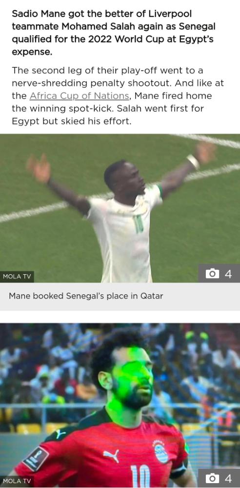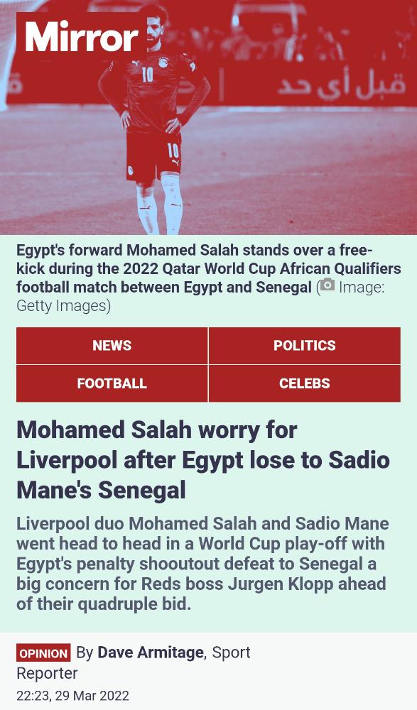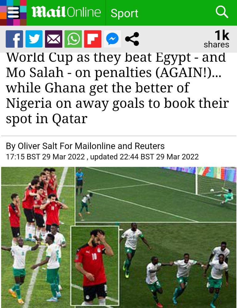 وقالت ديلي ميل إن محمد صلاح تلقى ضربة قاضية من ساديو ماني مجددًا عقب فوز السنغال على مصر بركلات الترجيح، وذلك كضربة ثانية عقب أسابيع قليلة من خسارة كأس الأمم الإفريقية.