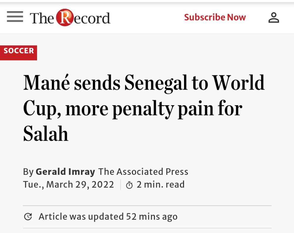 وقالت ريكورد عن المباراة إن ساديو ماني قاد منتخب السنغال بركلة الجزاء الحاسمة إلى كأس العالم مع إهدار محمد صلاح ركلة مصر.