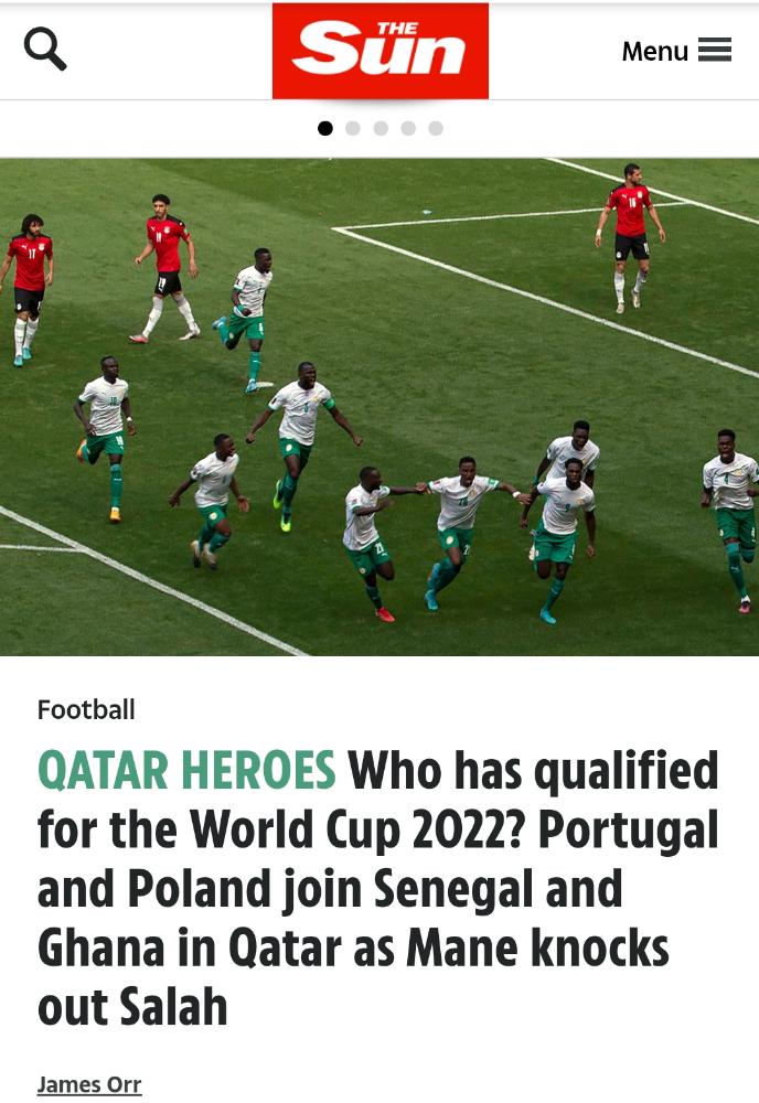 وقالت ذا صن، في تقريرها، إن ساديو ماني التحق بروبرت ليفاندوفسكي، النجم البولندي، في قائمة المتأهلين إلى كأس العالم قطر 2022، عقب الفوز بركلات الترجيح أمام منتخب مصر بقيادة صلاح.