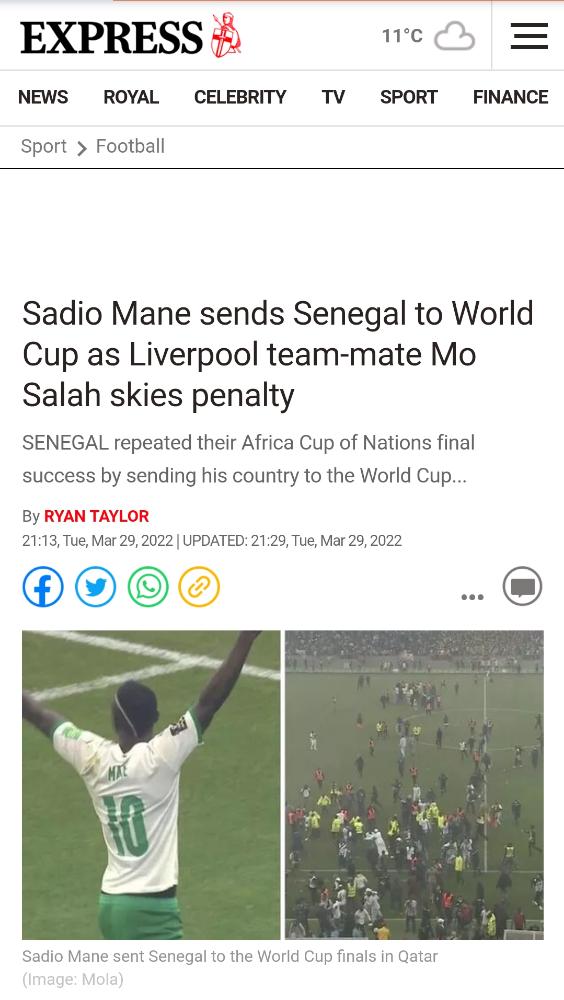 قالت صحيفة ديلي إكسبريس الإنجليزية إن ساديو ماني أرسل منتخب السنغال إلى كأس العالم في ليلة إهدار محمد صلاح ركلة جزاء منتخب مصر.