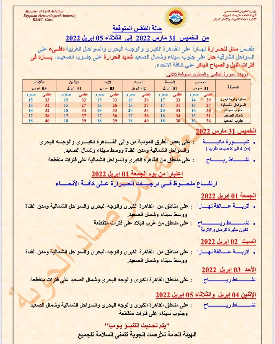 وأصدرت الهيئة العامة للأرصاد الجوية نشرتها الأسبوعية لحالة الطقس في البلاد، اعتبارا من اليوم الخميس الموافق آخر أيام شهر مارس، وحتى يوم الثلاثاء القادم الموافق 5 أبريل القادم لعام 2022.