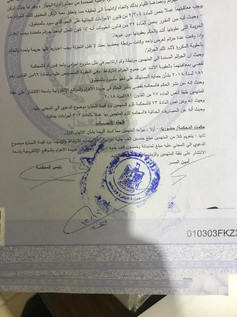 - تغريم الشركة مبلغ 50 ألف جنيه مصري عن الاتهامات الموجهة إليها.