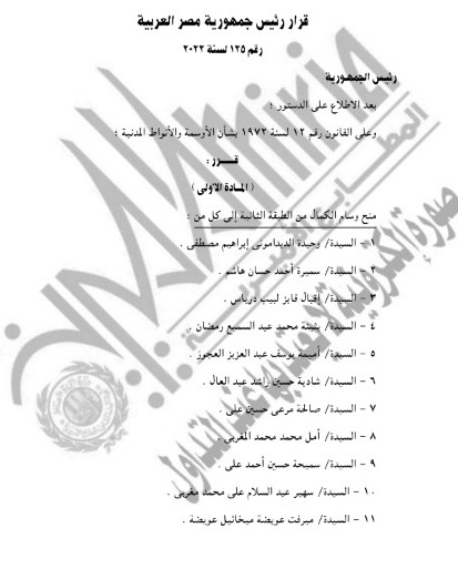 نشرت الجريدة الرسمية، في عددها الصادر اليوم الخميس، قرار الرئيس عبد الفتاح السيسي رقم 125 لسنة 2022، بمنح وسام الكمال من الطبقة الثانية لبعض السيدات.