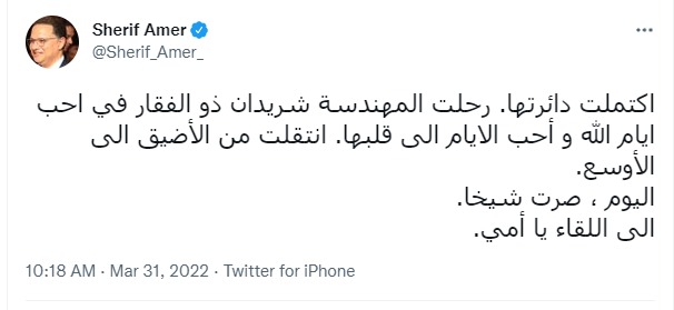 أعلن الإعلامي شريف عامر، مقدم برنامج ما يحدث في مصر على قناة إم بي سي، وفاة والدته شيريدان ذو الفقار.
