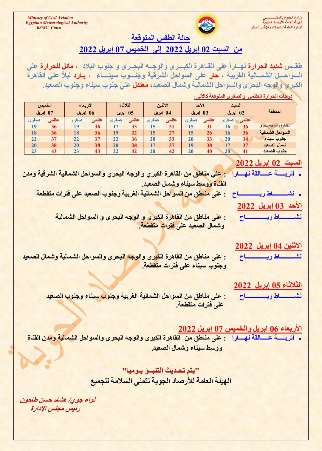 ونشرت هيئة الأرصاد الجوية المصرية توقعاتها لحالة الطقس خلال الأسبوع الجاري بداية من اليوم السبت حتى يوم الخميس المقبل الموافق 7 أبريل لعام 2022.