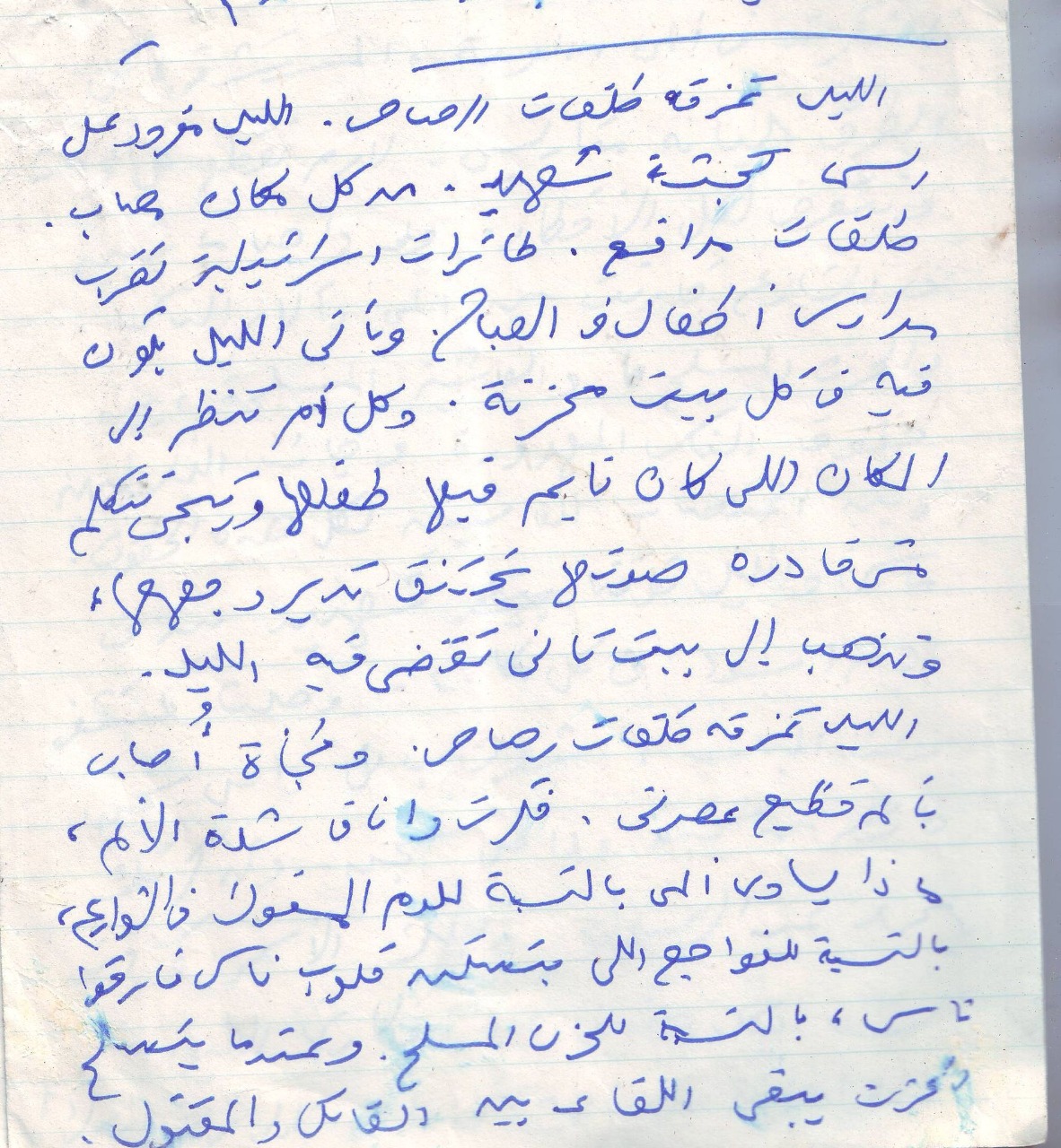 الليل تمزقه طلقات الرصاص.. الليل مفرود على السما كجثة شهيد.. من كل مكان مصاب.. طلقات مدافع طائرات.. طائرات إسرائيلية تضرب مدارس أطفال في الصباح.. ويأتي الليل يكون في كل بيت محزنة.. وكل أم تنظر إلى المكان اللي كان نايم فيها طفلها.. وتيجي تتكلم مش قادرة، صوتها يختنق، تدير وجهها، وتذهب على بيت تاني تقضي فيه الليل.